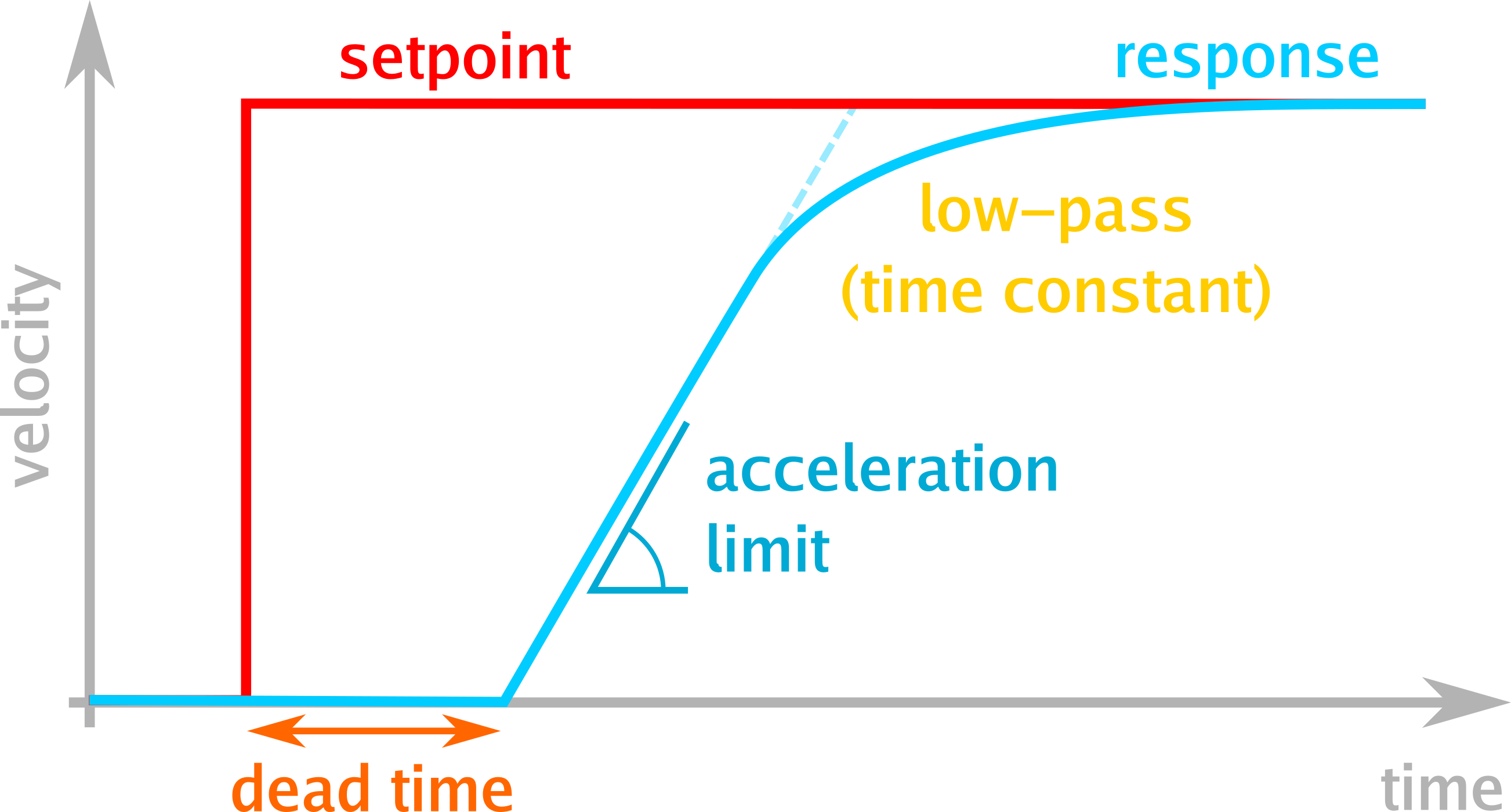 - dead time: The duration it takes for the signal to have any physical effect. This is usually a combination of delays from serial transmissions, layered control loops, and motor driver limiters. In well-designed systems, this delay is negligible (milliseconds); in practice, however, even expensive systems with cascaded controllers often have delays of 200 ms or worse.